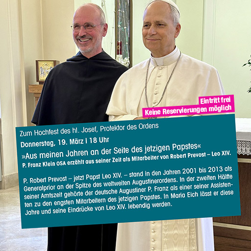 Seit 1953 leben und arbeiten wir Augustiner in Maria Eich, betreuen den Wallfahrtsort und begleiten Menschen auf ihrer Suche. Einen Überblick über die Gottesdienste und seelsorglichen Angebote gibt unser Jahresprogramm. Kommen Sie gerne vorbei – wir freuen uns auf Ihren Besuch!